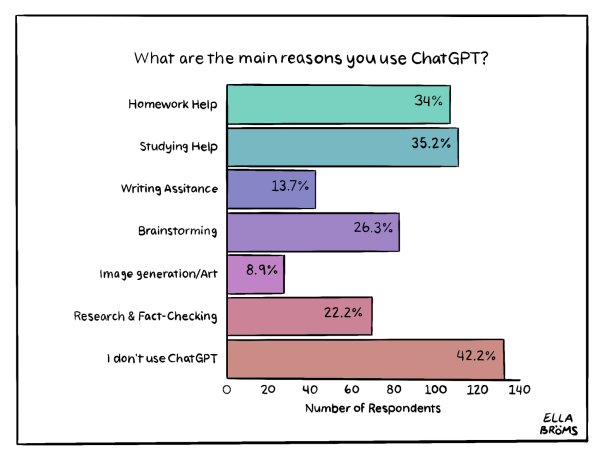 In comparison to OPHS students, of the people who use ChatGPT, 34.5% of OPHS students use the model for homework help, 35.8% for studying help, 13.9% for writing assistance and 26.8% for brainstorming art.